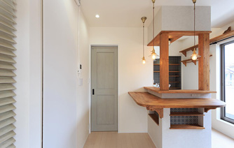 「狭くて薄暗い廊下を広げたいという夢をお持ちだったお施主様。構造を調べて柱を抜いても問題ないことがわかり、廊下の幅を広げることができました。無垢材を使い、様々な用途に合わせてオリジナル家具を造作。どの部屋も木の味わいを楽しめる家になりました。」