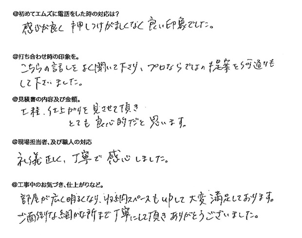 工事の大小にかかわらない林さんの誠意ある対応に、工事前から安心しておりました。工事中の職人さん方も礼儀正しく確かな技術で丁寧な仕事をなさると感じております。