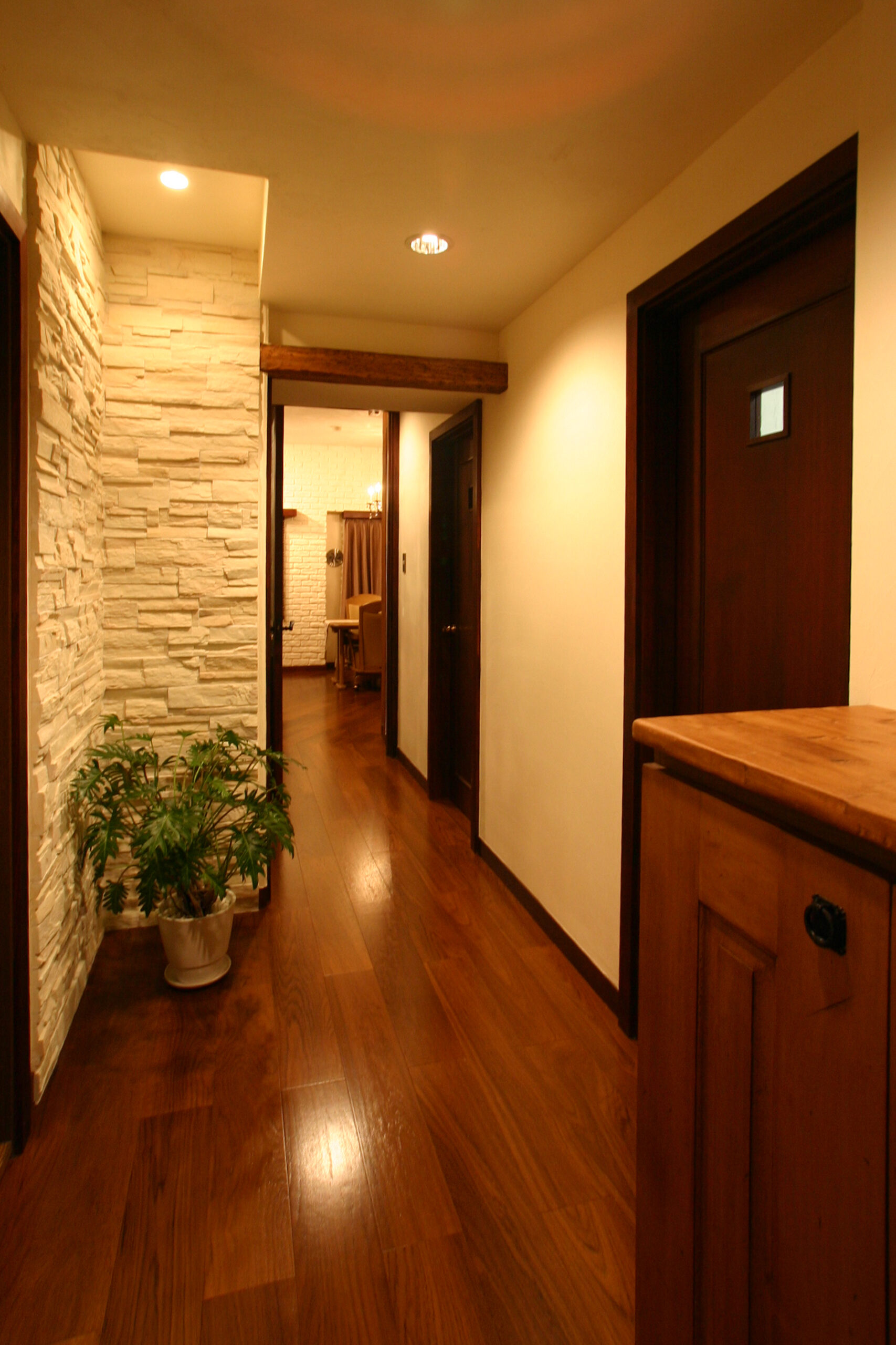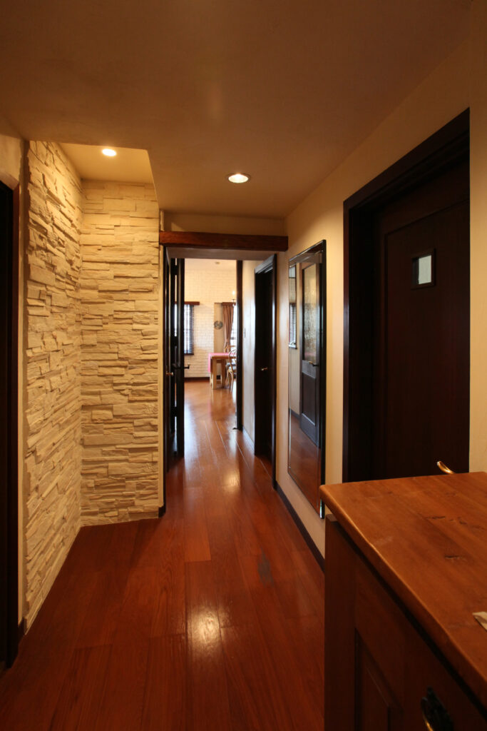 廊下やリビングの壁面には、もちろんすべて本物の素材を使っています。